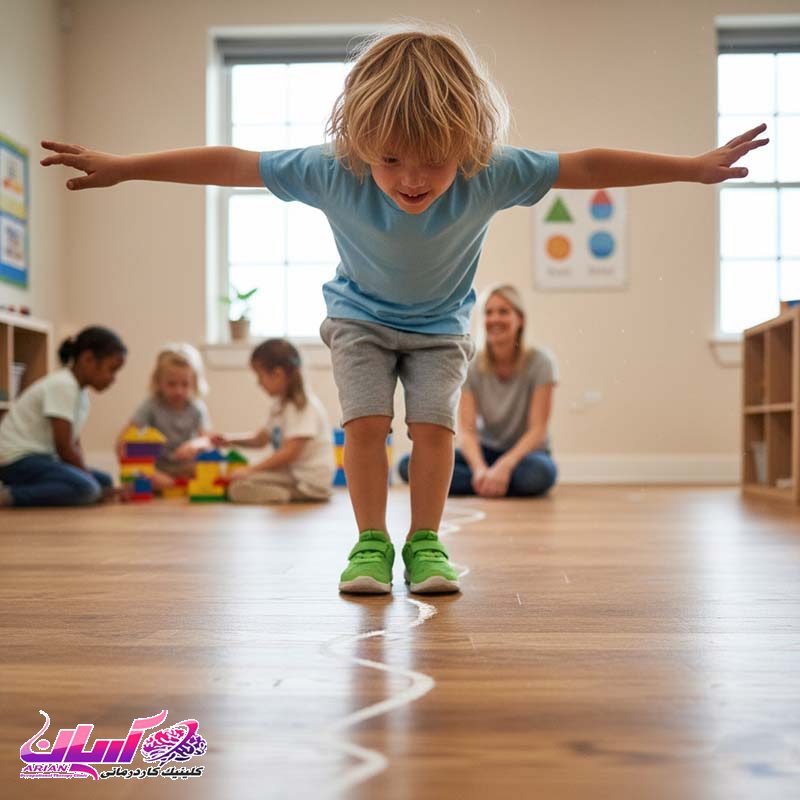 🤸 راه رفتن روی خط: یک خط روی زمین بکشید و از کودک بخواهید روی آن راه برود.
